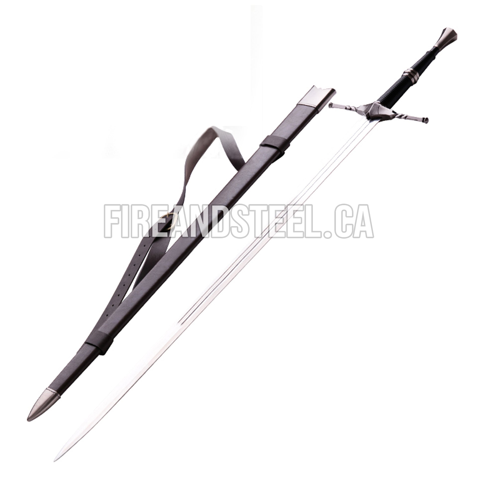 Our masterfully crafted real sword is inspired by Geralt’s Steel Gwyhyr, seen in his first appearance in the E3 promotional trailer for The Witcher 3: Wild Hunt. This handmade quality stainless steel replica of Geralt’s Steel Gwyhyr is 126 cm (50 in) long. It comes with a high quality leather wrapped wooden scabbard with zinc alloy fittings, as well as a buckled leather back strap. It is produced as a standalone collector’s sword. The sword is blunted and is an ideal home decoration or cosplay photoshoot accessory.
