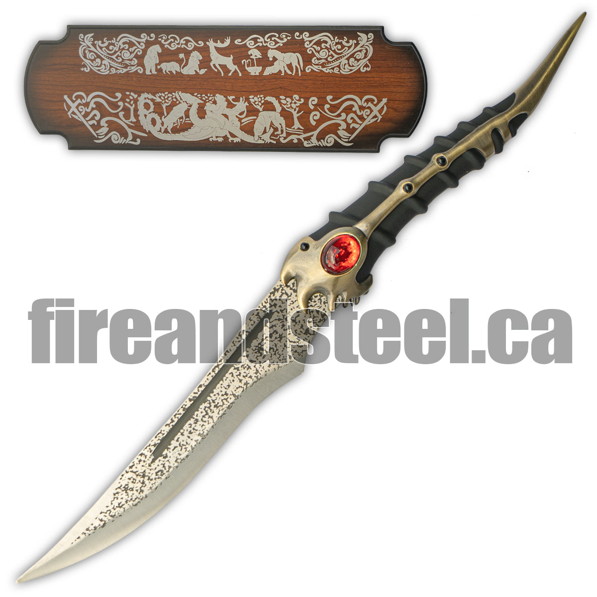 Our masterfully crafted real dagger is inspired by the Assassin’s Golden Dagger, including the iconic pointed hilt and gold and red trimmings. This handmade quality stainless steel replica of the Assassin’s Golden Dagger is 49 x 4 cm and 0.4 kg (1 lb). It comes with a beautifully intricate wooden display plaque that can be mounted on a wall. The dagger is blunted and is an ideal home decoration or cosplay photoshoot accessory.