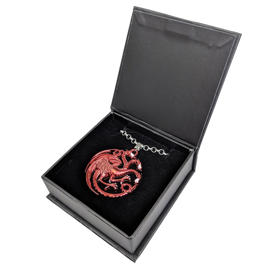 Our masterfully crafted necklace is inspired by the Dragon family’s sigil, including the unique dragon design and iconic motto engraving. This handmade quality zinc alloy replica of the Dragon sigil is 4.5 x 4.5 cm. It comes with a chain and a magnetized Fire and Steel silver foil jewelry box. The necklace is an ideal cosplay photoshoot accessory.
